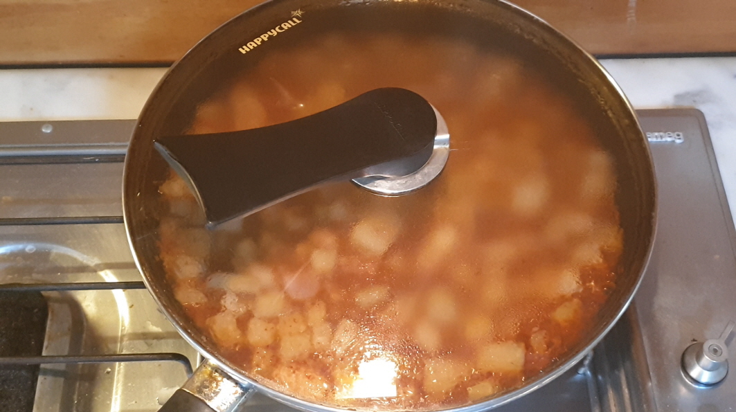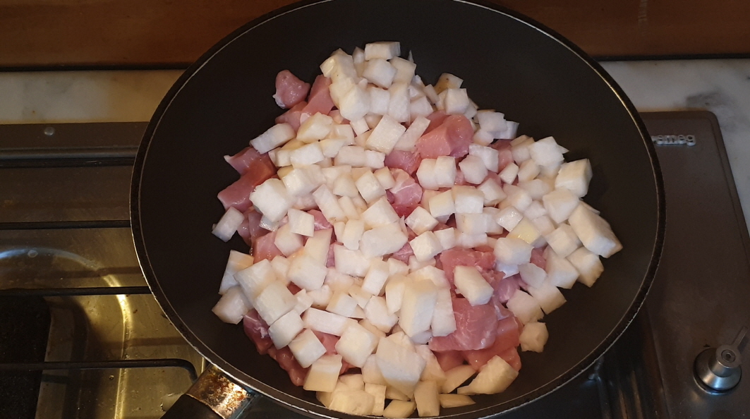 팬에 고기와 무를 넣고 물을 자작하게 넣어 주었습니다. 덮밥이기 때문에 물은 너무 많이 넣지 않도록 하세요.