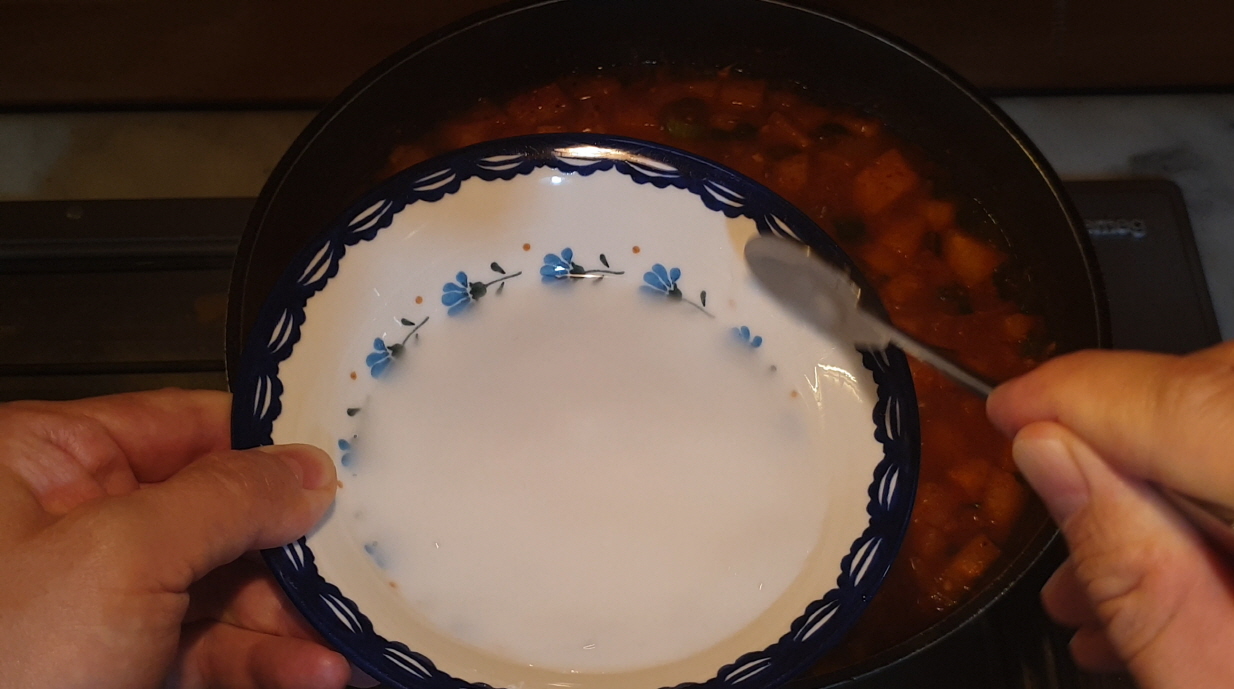 전분 2큰술을 물에 개어 넣어 줍니다. 그럼 국물이 걸쭉하게 변합니다.