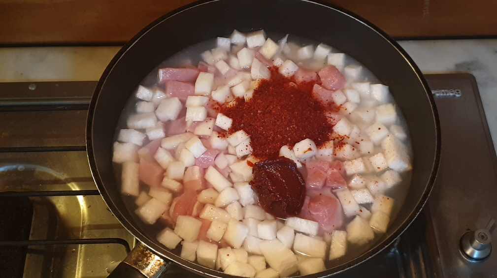 - 돼지고기 600g, 무, 고추장, 고춧가루 간장, 맛술, 설탕, 대파, 마늘, 매운 고추, 전분가루